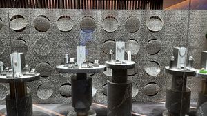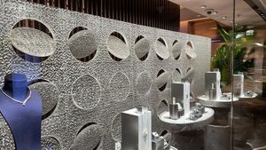 A transformative storefront backdrop exudes elegance and dynamism with meticulously crafted 2-dimensional round shapes cut from and integrated back into the panel. The interplay of shapes, particularly circles, viewed from diverse angles, undergoes a fascinating metamorphosis, evolving into captivating ovals in varying orientations. The visual transformation ignites curiosity and adds an eye-catching touch of glamour to the space.