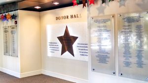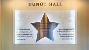 The donor wall of this prestigious institution uses Scintilla panels to create a stunning commemoration to the companies and individuals that support the National Institutes of Health (NIH). The panel in this Douglas Group design is edge lit while the star mounted on its surface has lighting on its perimeter, shining back at the panel, whose internal optical structure acts to absorb this light and re-emit it elsewhere creating a mysterious glow around the star. Z-Clips fasten the panel to the wall, eliminating any visible hardware.